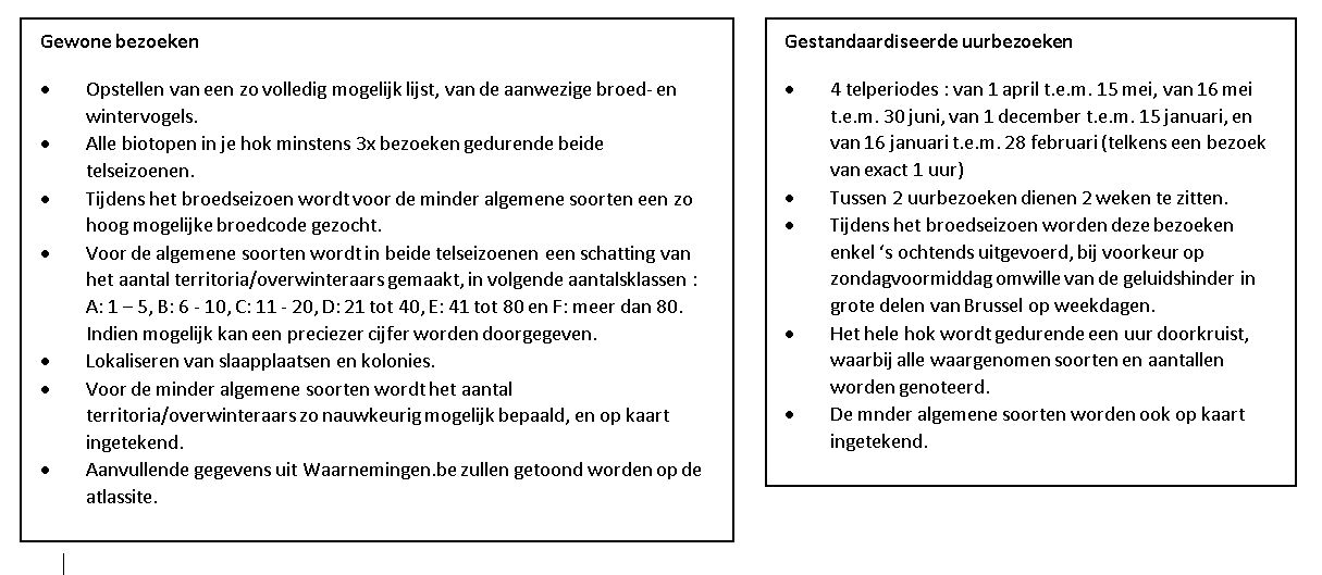 - Gewone bezoeken. Bezoek alle biotopen binnen je atlashok minstens 3 keer gedurende elk seizoen (broedseizoen en winter).